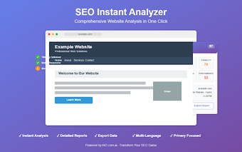 SEO Instant Analyzer, Chrome tarayıcı uzantısı olarak, kullanıcıların web sitelerinin SEO performansını, mobil uyumluluğunu, kullanılabilirliğini ve sosyal medya entegrasyonunu hızlı bir şekilde analiz etmelerini sağlar. Bu araç, kullanıcıların herhangi bir web sitesinin temel SEO unsurlarını değerlendirerek, detaylı geri bildirim ve öneriler sunar. Kullanıcı dostu arayüzü sayesinde, herkesin kolayca kullanabileceği bir çözüm sunar.